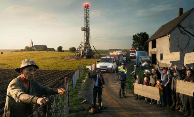 Am dritten Tag der Bohrungen stellt sich der Dorfplatz neu auf. Eine Bäckerin verteilt Brezeln an Demonstrierende, ein Rentner trägt ein Schild: „Unser Boden, unsere Regeln“. Der Bürgermeister versucht, beide Seiten an einen Tisch zu bringen, am Ende gibt es Kaffee, aber keine Lösung. An der improvisierten Absperrung halten Eltern ihre Kinder zurück, als ein Ventil geöffnet wird. „Hören Sie das?“, ruft jemand, „das ist unser Leben, das da rauscht.“ In einem Haus am Feldrand reißen Risse die Tapete, ob vom Verkehr oder der Vibration – niemand weiß es so genau. Doch das Unbehagen ist messbar.