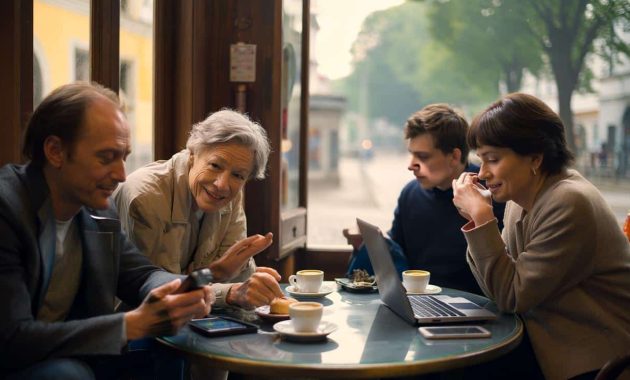 By the window, four retirees in their late 60s are laughing over tiny cups of espresso, arguing about which sea is colder, the Atlantic or the North Sea. Their phones are on the table, screens black, forgotten.